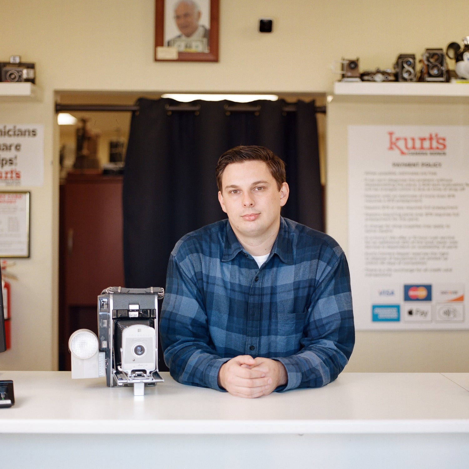 When I’m not behind the counter here at Kurt’s Camera, you can find me hosting analog process workshops and attending various community events. I also enjoy playing Pathfinder, listening to vinyl records and hanging out with my furry co-pilots, Goose and Maverick.